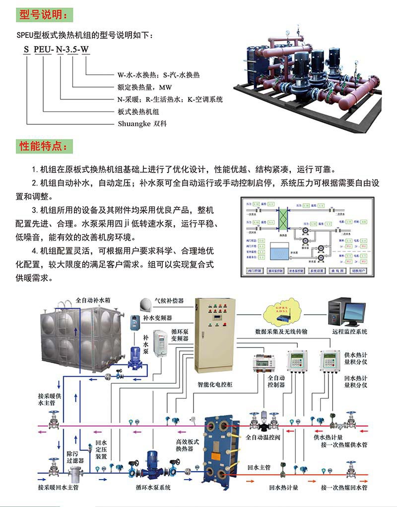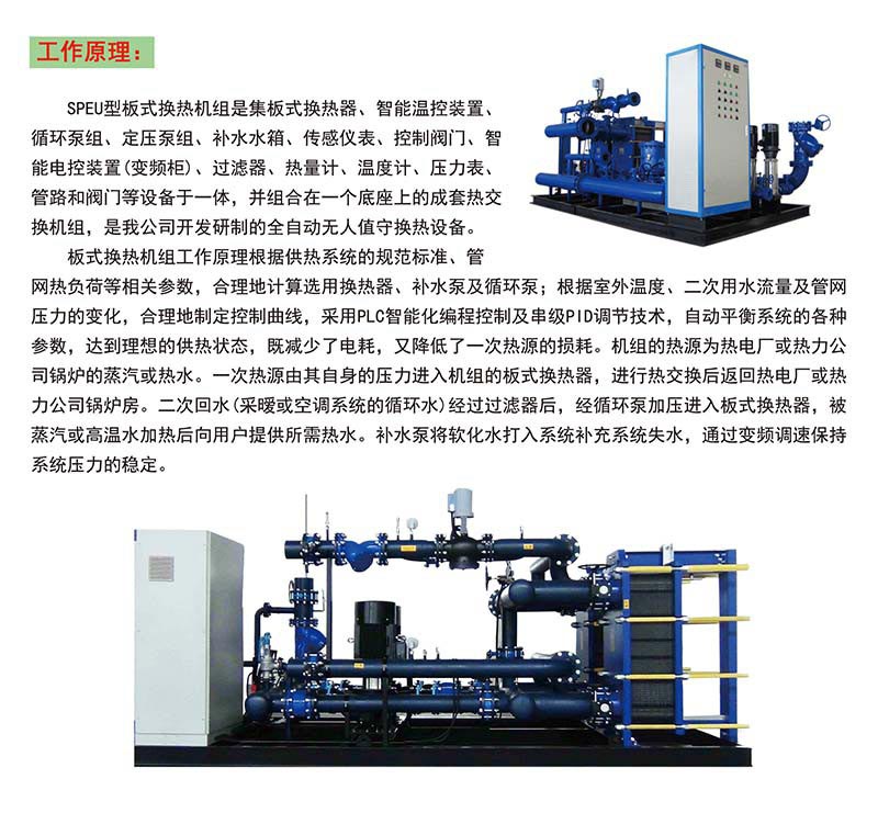 SPEU型板式換熱機組是我公司根據我國供熱行業發展趨勢,專門針對供暖區域來設計開發的有效型換熱機組,是集城市供熱技術、智能化控制技術與人性化結構設計于一體的智能型熱交換機組,具有強大的功能來完成所有建筑物的各種區域熱能需求。可廣泛適用于工廠、機關、學校、住宅小區、別墅等民用建筑;商場、賓館、飯店、度假村等商用建筑的采暖、空調、洗浴用水、生活用水、游泳池冬日用水。