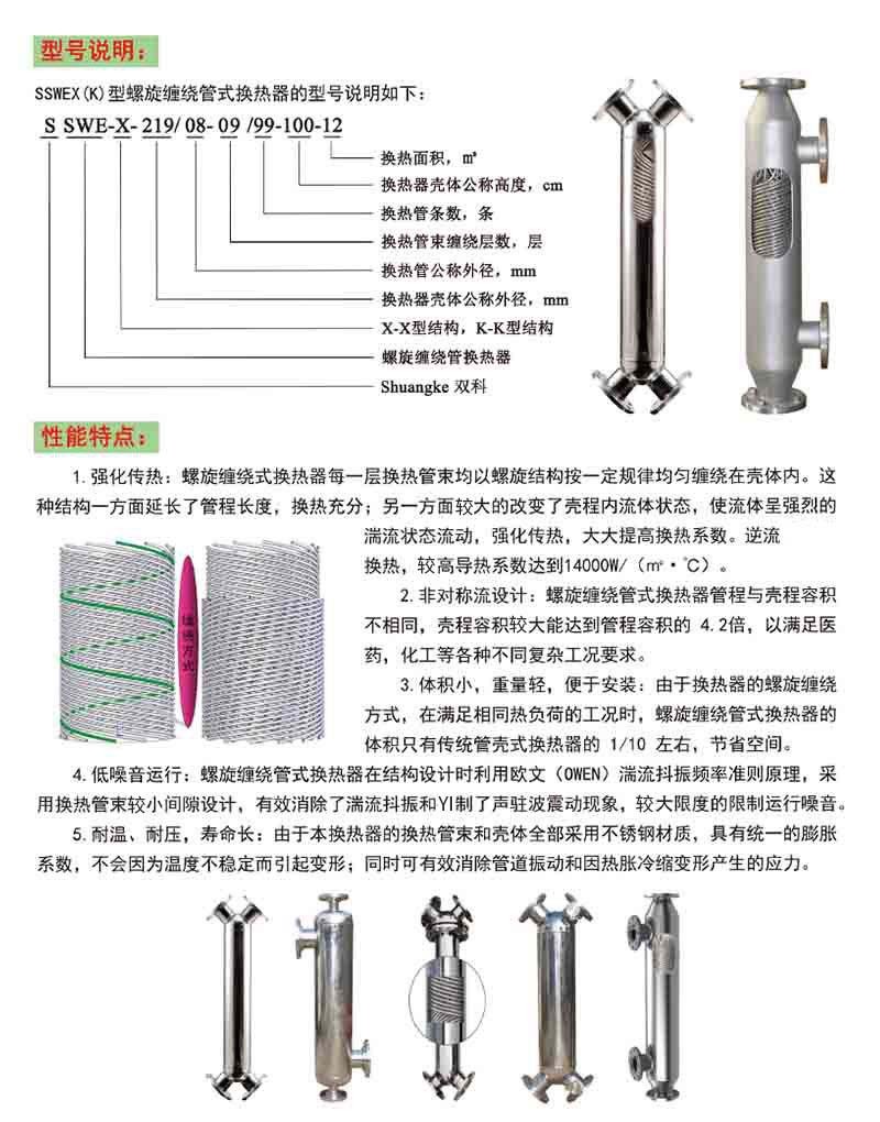 3)換熱效率和冷凝,因而節能。盡管螺旋導流纏繞管式冷凝器體積小巧,但由于螺旋纏繞曲線,氣態介質在換熱管束中停留時間長,不用經過二次換熱。